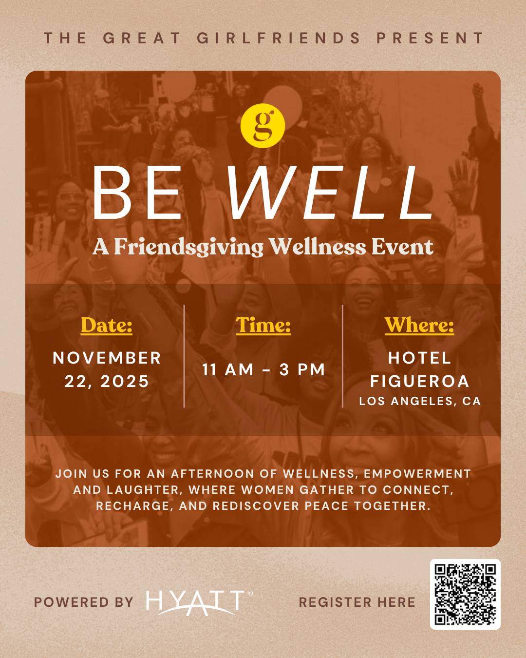 Hey girl, hey, Remember how I said we're getting together in November to celebrate Friendsgiving and have a wellness experience? Well, I hope you're ready because it's time to get togethaaaaa! Be Well is our Friendsgiving wellness event, powered by Hyatt, that will unite us for one afternoon of wellness, tranquility, and sisterhood in our very own urban oasis at Hotel Figueroa! We'll enjoy brunch bites, meet new girlfriends, have a wellness workshop by Dr. Tara Jenkins, a live podcast...